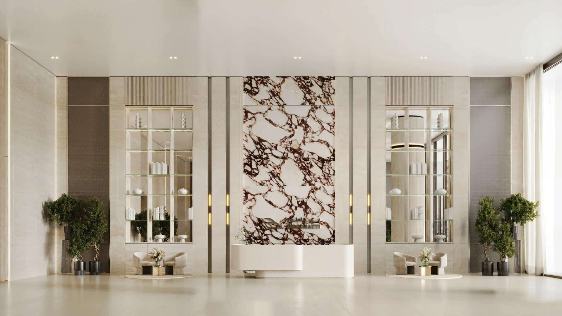 Luxury interiors crafted from premium materials such as marble, travertine, oak wood, and antique brass for an elegant and timeless look.