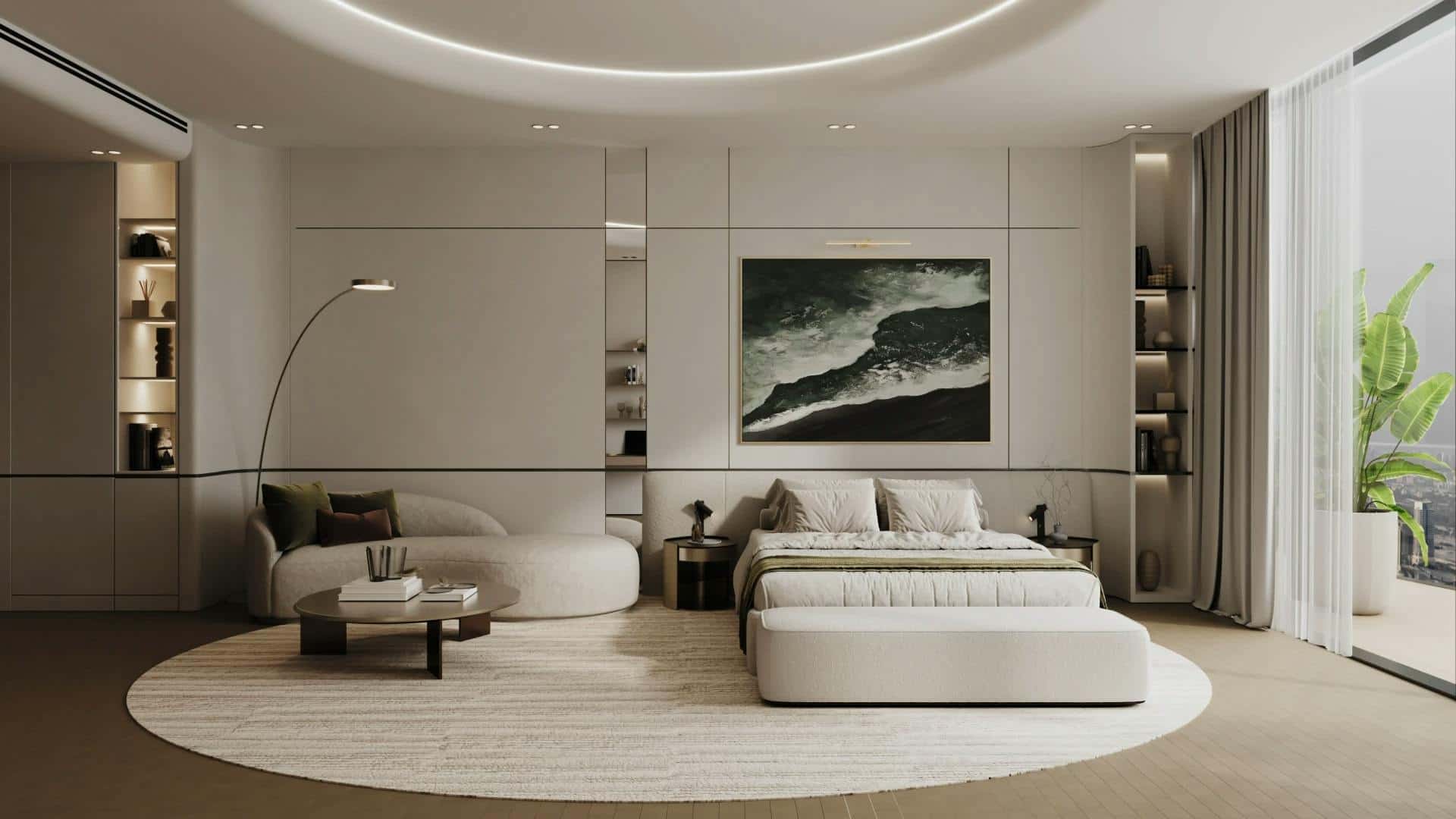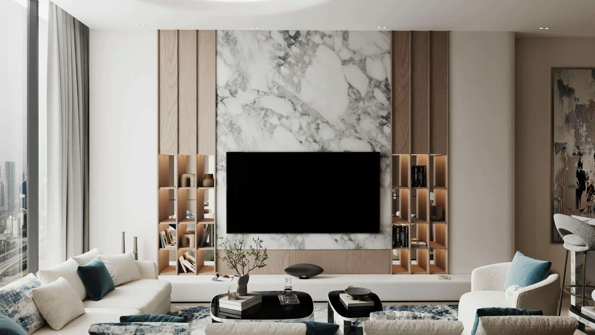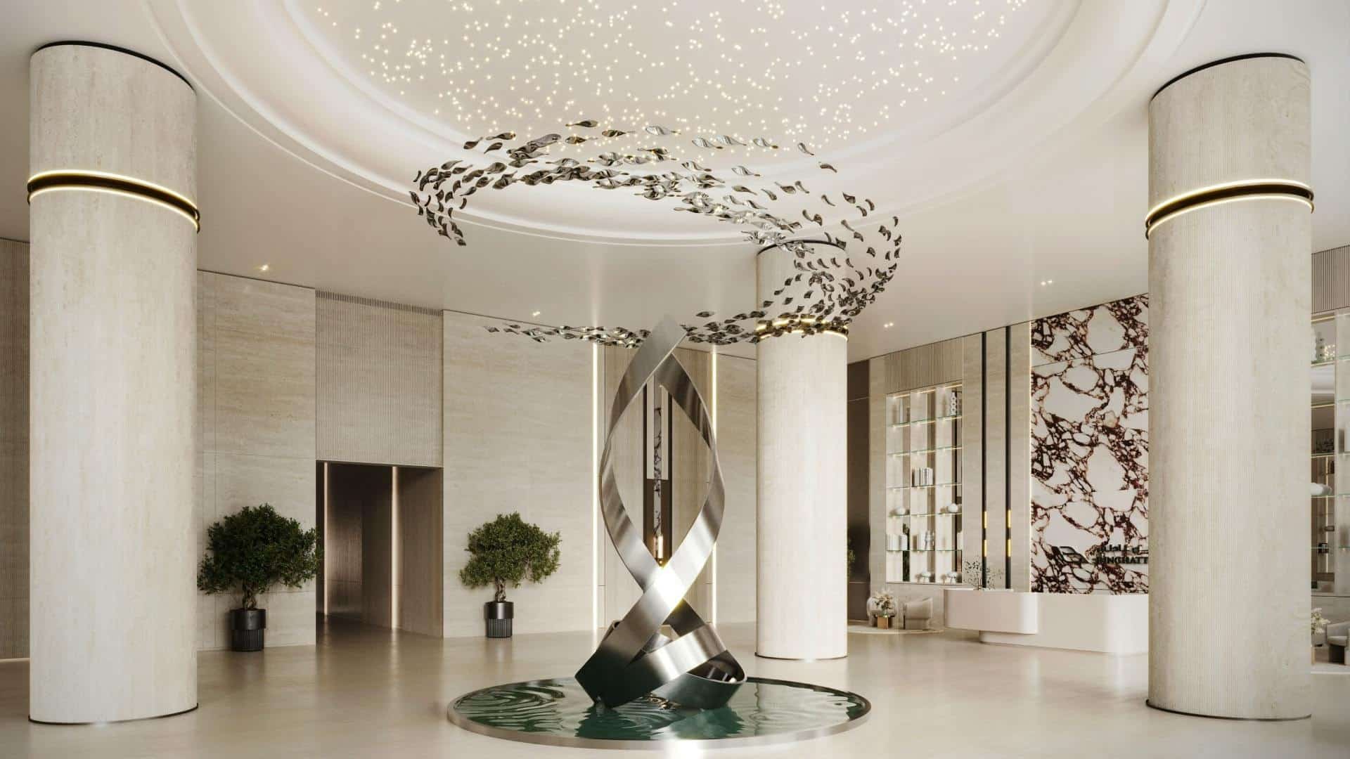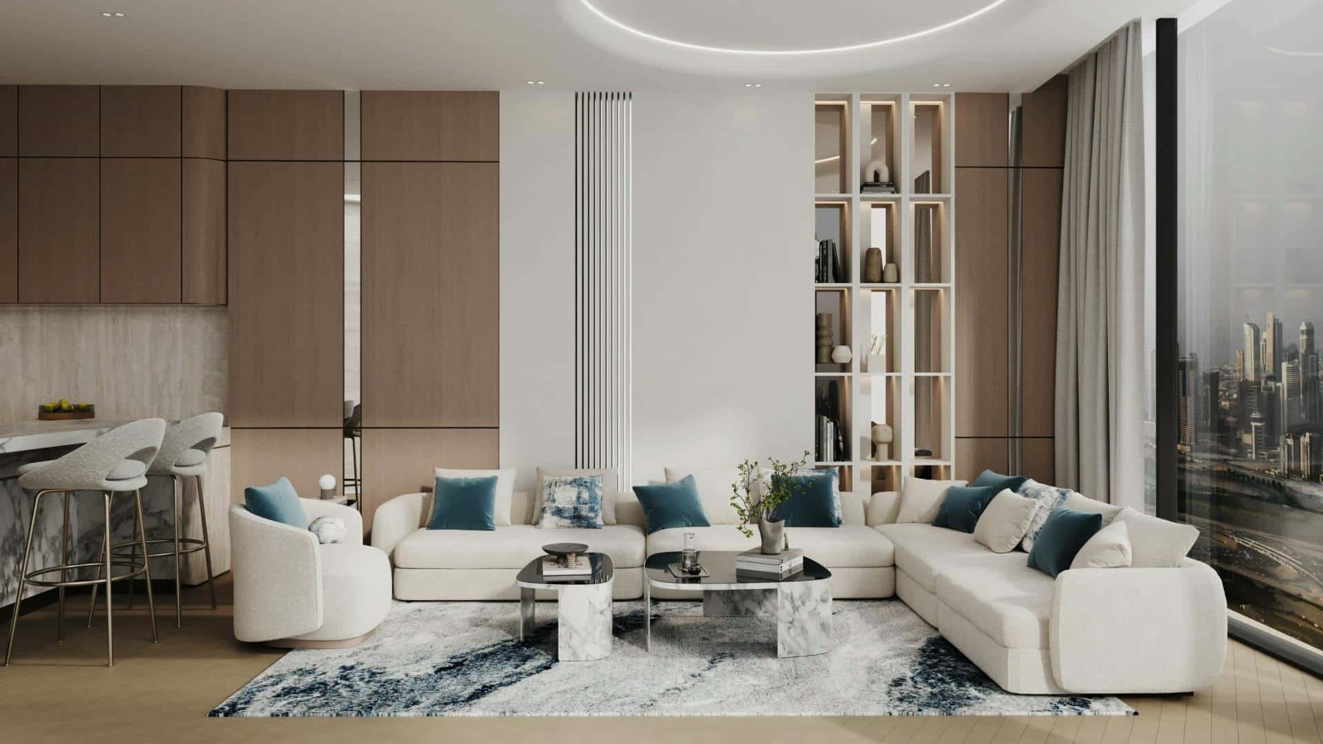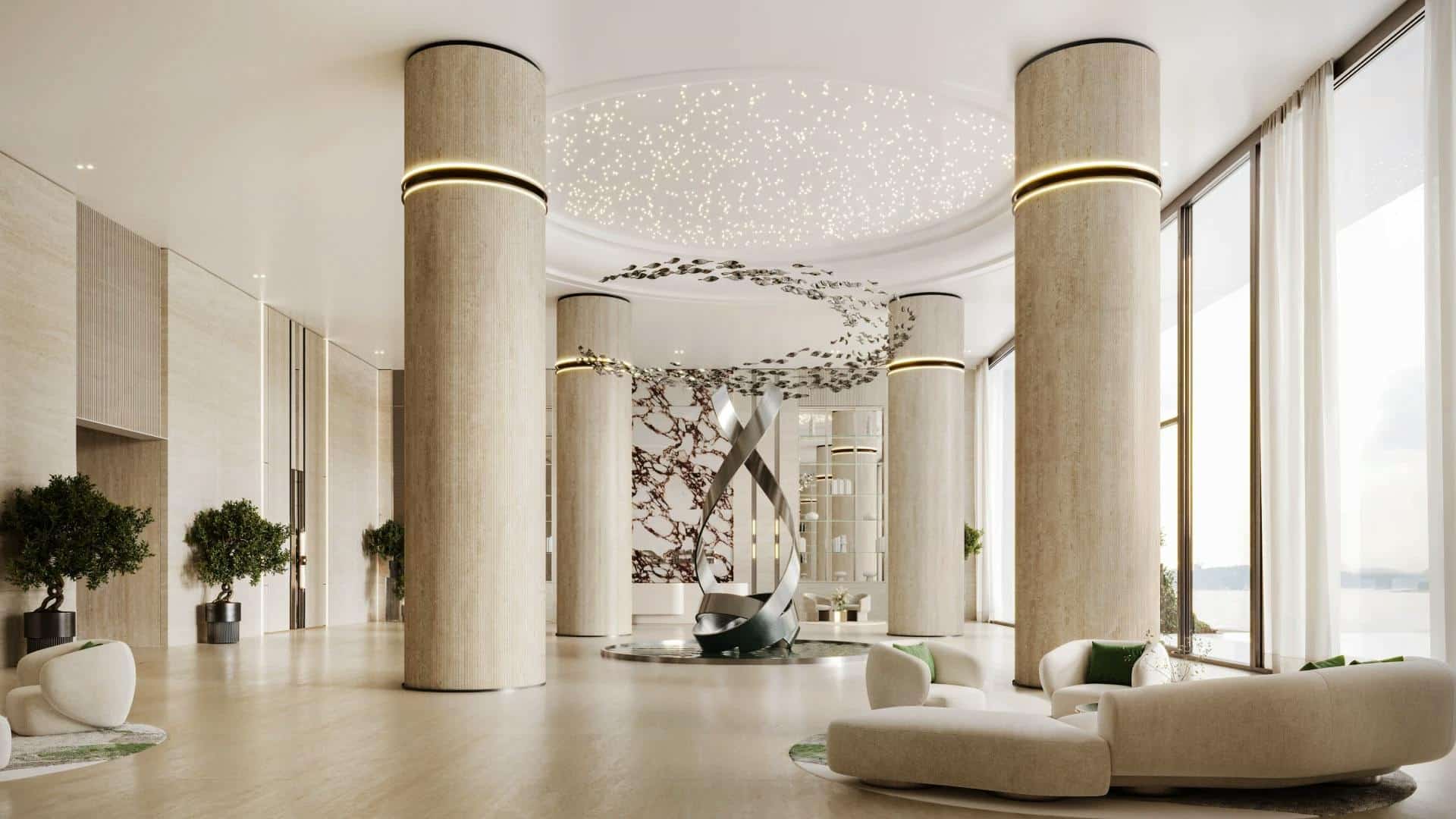 Interiors are designed to inspire contemporary living and modern society. The dialogue between marble, travertine, oak wood, antique brass details, and profiled white panels is reflected through the elegance of glazed surfaces, where light and calm are amplified by the combination of materials. Smart technologies are discreetly integrated, and high-quality eco-friendly materials demonstrate efficiency, responsibility, and sustainability. From studios to the most spacious apartments, every layout is designed with precision and aesthetic sensitivity.