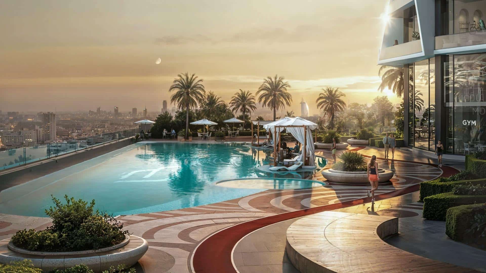 World-class recreational facilities including pool, padel court, basketball court, jogging track, indoor gym, and cabanas for relaxation.