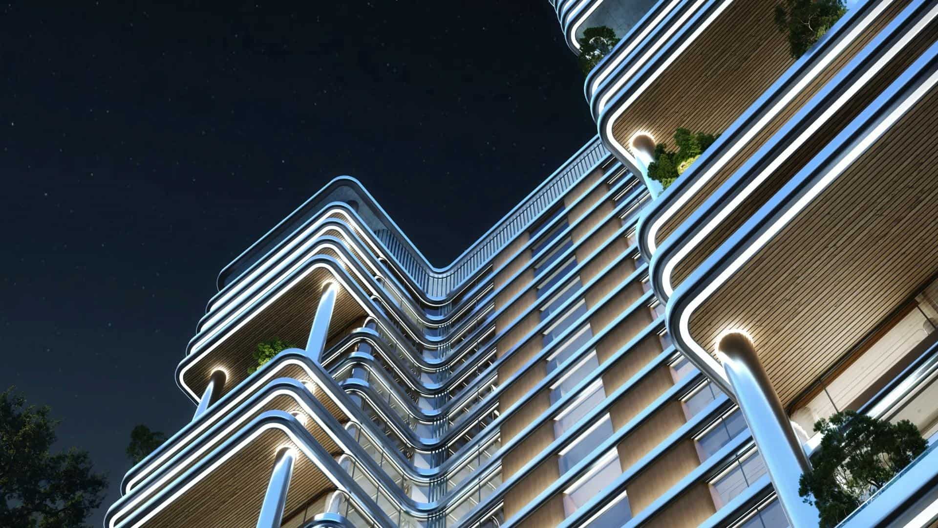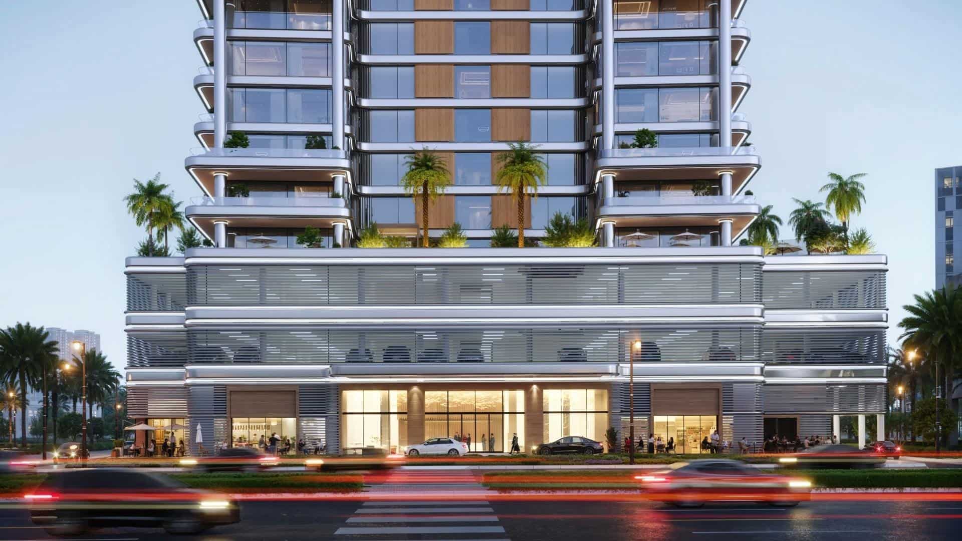 The architecture shapes experiences, telling the story of exclusivity and style through a new definition of urban living. The building rises elegantly on a 3B+G+2P podium, including 21 residential floors and totaling 402 units: 320 studios and 82 one-bedroom apartments. Its profile combines sharp angles with rounded lines, creating a remarkable and comforting presence. The GRC-finished façade and elegant spaces reflect Binghatti’s architectural DNA. Corridors, 1.6–1.8 metres wide, offer a sense of space on every level, complemented by six passenger lifts and service lobbies.