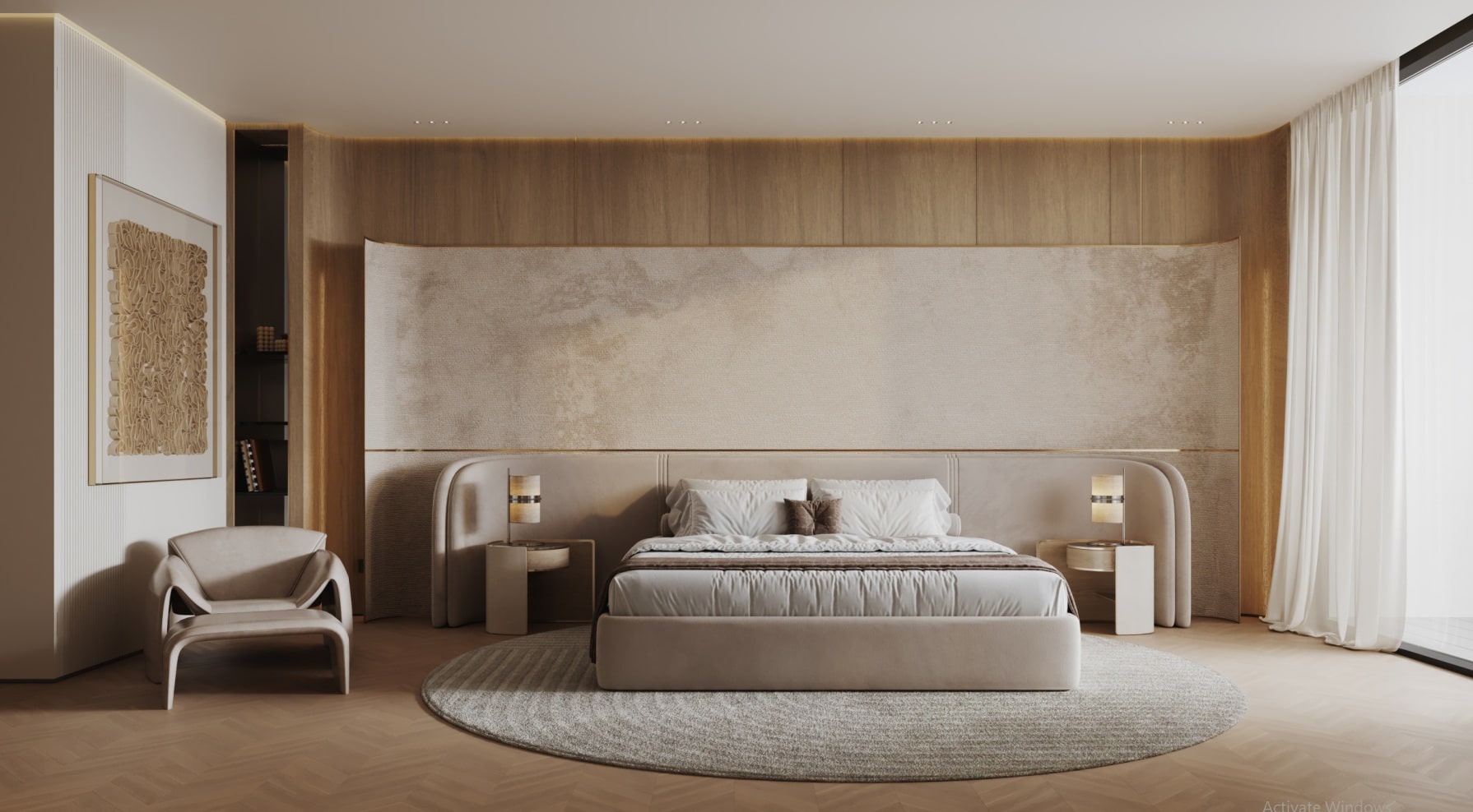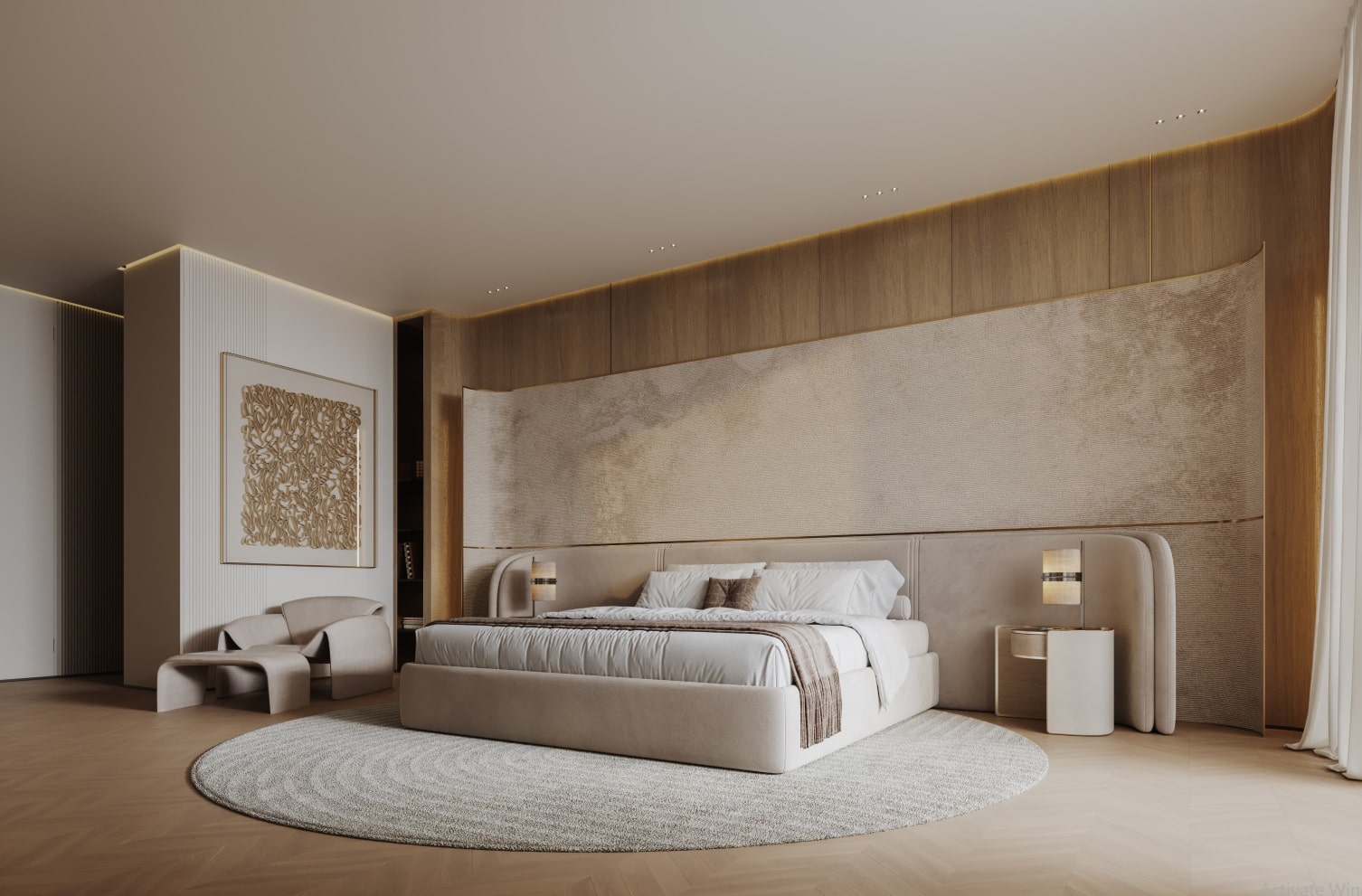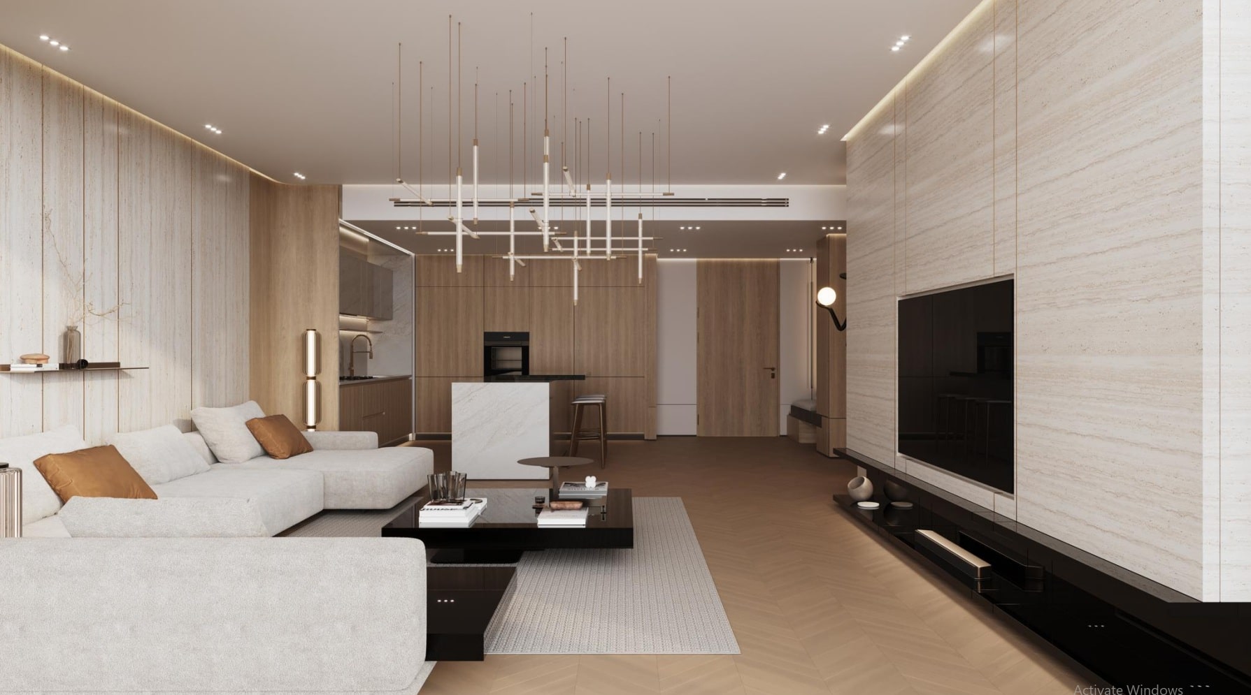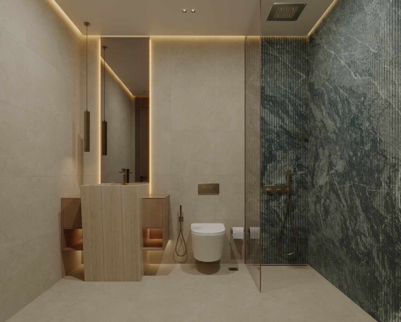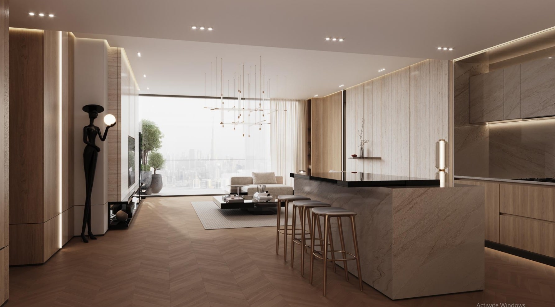 The project’s architecture combines modern materials such as crystal-clear glass, brushed metal, and golden accents, creating a strong yet refined presence on Dubai’s skyline. Interiors reflect the same attention to detail: wood-effect porcelain floors in the living areas, exotic green porcelain and travertine in the bathrooms. Light oak wood, smoked glass, and Corian countertops add discreet elegance, creating a warm, functional, and pleasant space.
